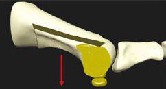 Puis, comme vous le voyez sur les schémas ci-contre, on sépare la tête du premier métatarsien de sa base avec une mini-scie oscillante. La tête de M1 est alors transférée vers le deuxième métatarsien pour réduire l'espace entre les deux premiers métatarsiens.
