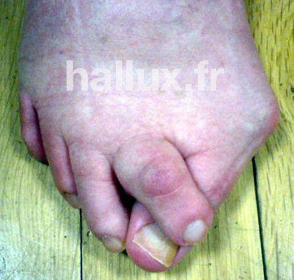 Par ailleurs, le gros orteil pousse progressivement les autres orteils vers l'extérieur du pied ; le deuxième orteil est chassé vers le haut par le premier, se recroqueville (griffe), source de cors et il apparait des douleurs de la base de ce deuxième orteil et un durillon plantaire : syndrome du deuxième rayon avec rupture de la plaque plantaire. Certains patients consultent à ce stade tardif : l'intervention est plus importante et le résultat plus aléatoire.