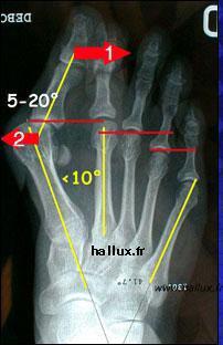 Le gros orteil se déplace vers les autres (1), tandis que le premier métatarsien (os situé à la base du gros orteil) se dirige dans les sens opposé (2). Cet angle forme une"bosse" qui n'est pas de l'os supplémentaire. L'opération devra corriger cet angle pour supprimer cette saillie. Les tendons prennent la "corde de l'arc" et accentuent encore cette déformation.