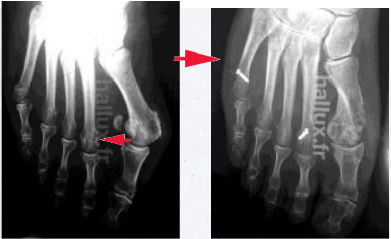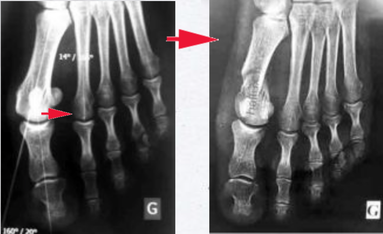 L'angle inter-métatarsien est corrigé par le transfert de la tête de M1 vers le deuxième métatarsien, fermant ainsi l'espace inter-métatarsien.